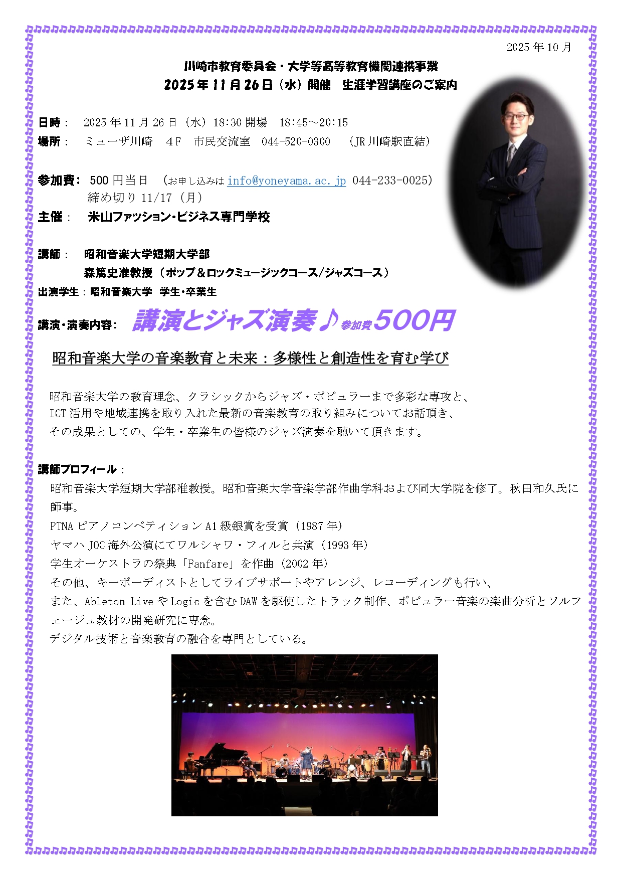 Lifelong Learning 生涯学習 生涯学習講座のご案内 2025年度の講演のご案内 申し込み受付中 昭和音楽大学 森篤史先生の講演とジャズ演奏♪参加費500円 — 昭和音楽大学の音楽教育と未来:多様性と創造性を育む学び — 講師:昭和音楽大学短期大学部 森篤史准教授 日時:2025年11月26日(水)18:30/開場:18:45~20:15 場所:ミューザ川崎 4F 市民交流室 受講ご希望の方は、お電話か・下記の「お問い合わせ」ボタンからお問い合わせ下さい。 044-233-0025 米山ファッション・ビジネス専門学校 お問い合わせはコチラ